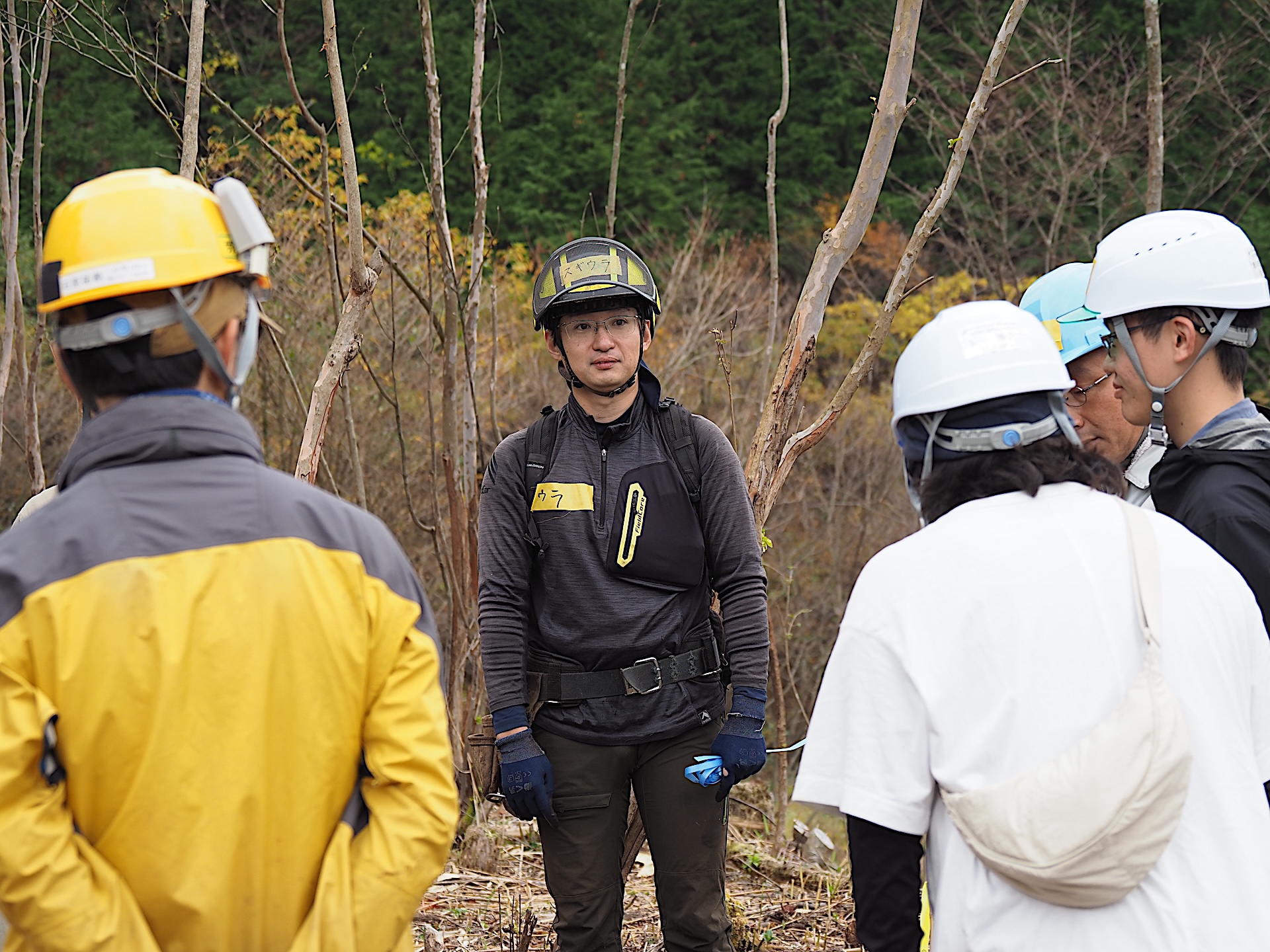 今年はエゴノキプロジェクト実行委員会に新しいメンバーが2人加わってくれました。郡上里山株式会社の杉浦義隆さんと、中濃森林組合の前場治佳子さんです。2人とも森林文化アカデミー林業専攻の卒業生です。当日は前場さんは他の仕事のため不参加でしたが、杉浦さんは班長として作業を率いてくれました。普段からシカ防護柵の設置や植樹を業務として行っているプロフェッショナルなので、本当に頼れる即戦力でした。